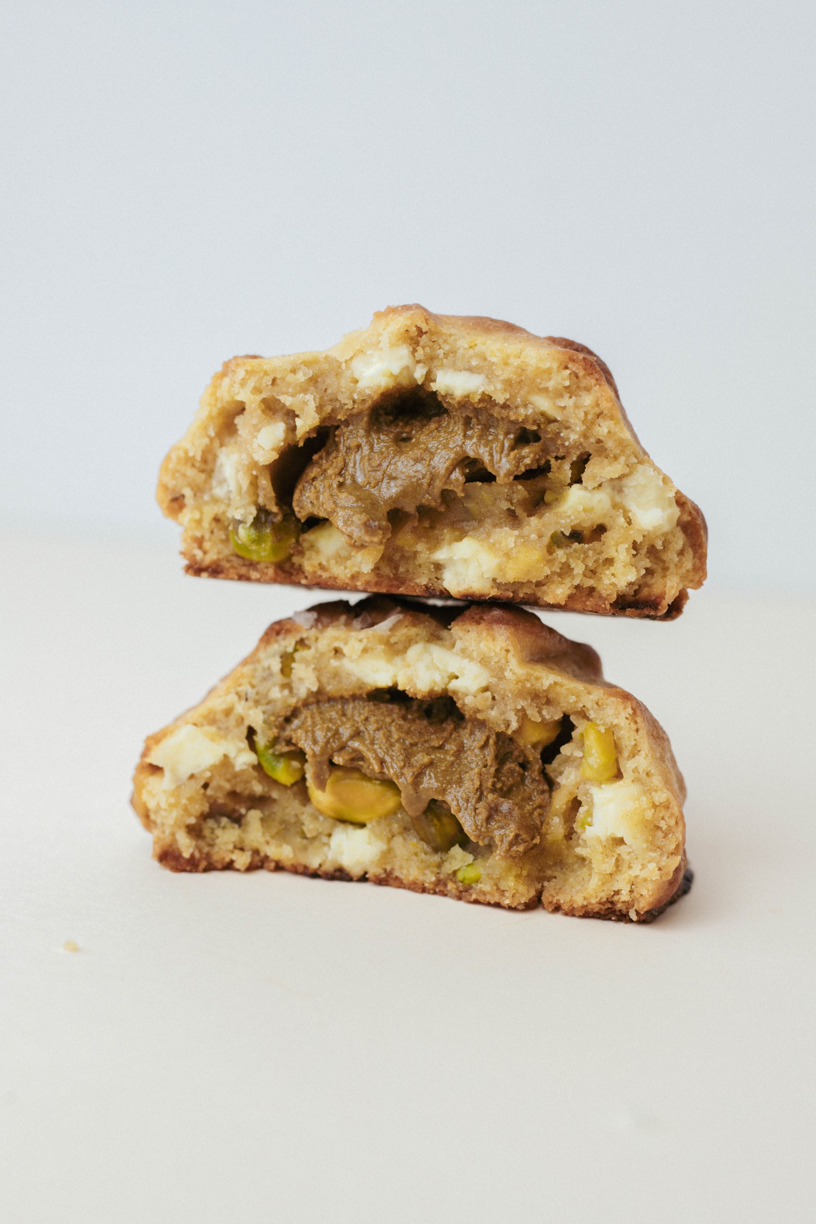 Cookie de masa suave con trozos de chocolate blanco y pistachos tostados, rellena de nuestra crema artesanal de pistacho siciliano, con un delicado toque de sal y aceite de oliva que realza el sabor y equilibra la dulzura.