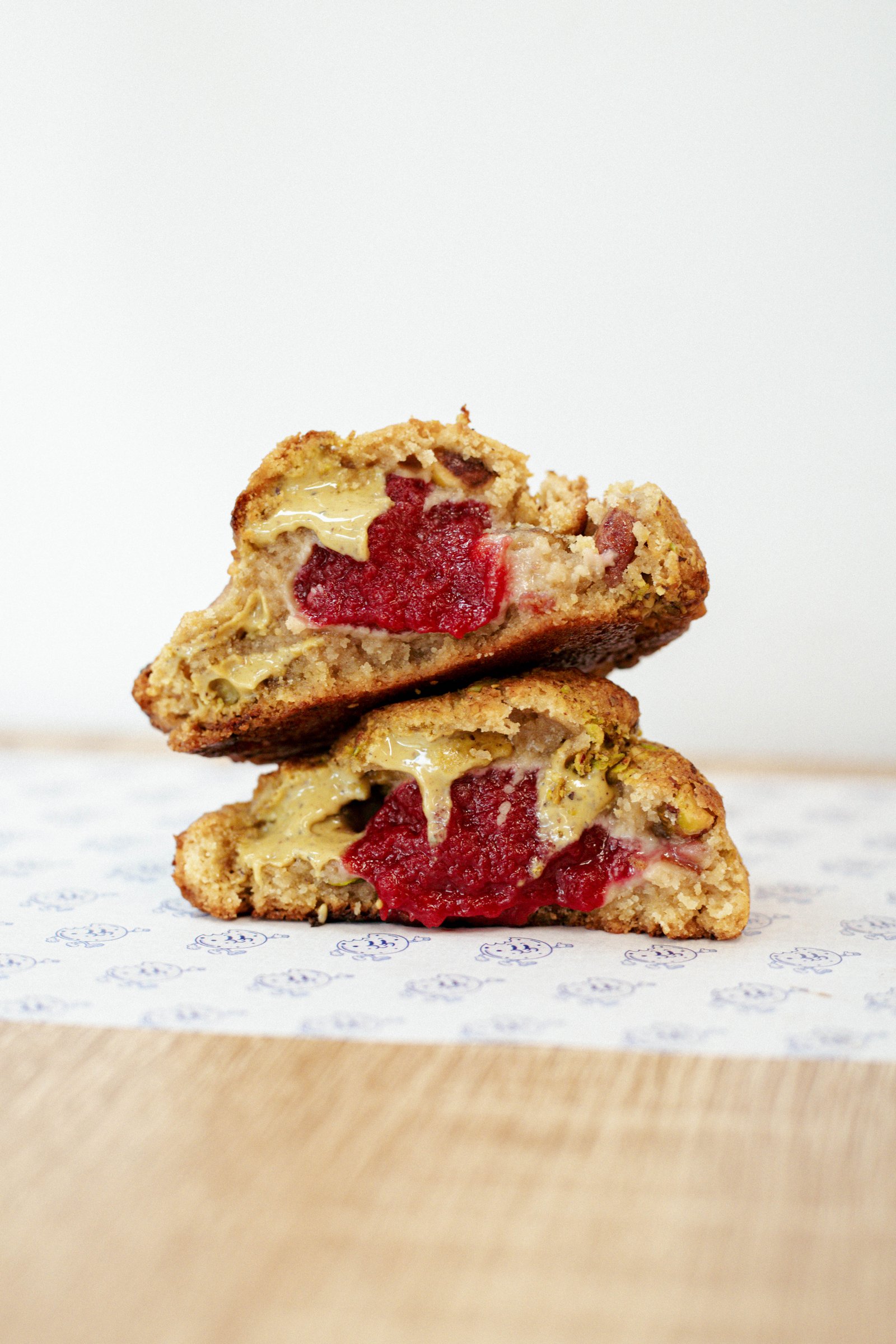 Nuestra versión vegana de una cookie emblemática: masa vegana con pistachos tostados, gianduja vegana de pistacho y relleno de gel de frambuesa, que aporta frescura y contraste.